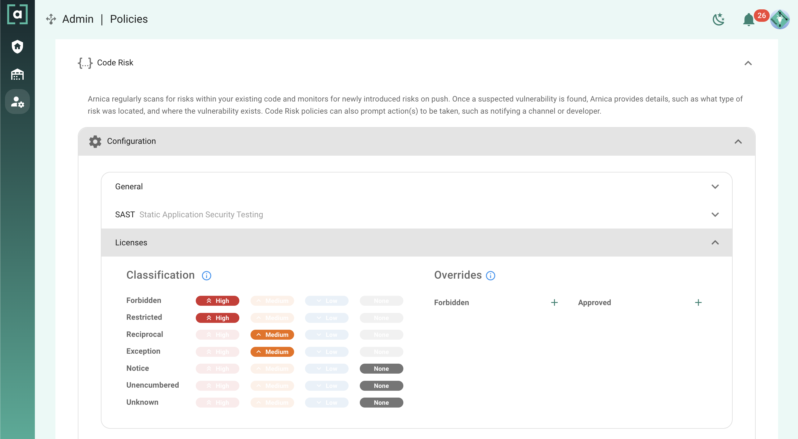 License classification risks can be modified and individual licenses can be overridden with forbidden or allowed classification.