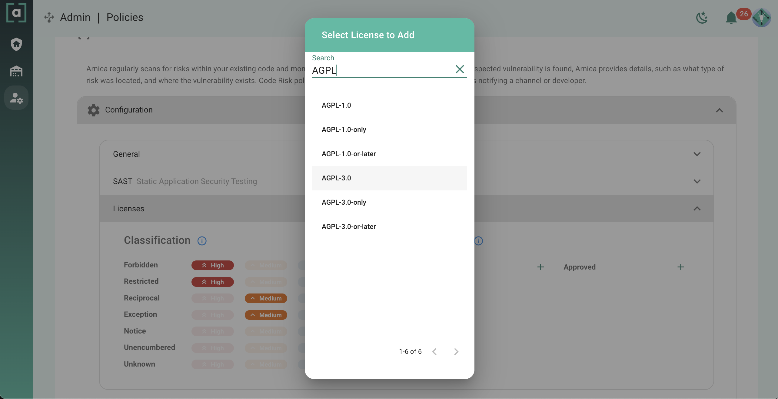 1. Navigate to the [policies page](https://app.arnica.io/#/admin/policy-v2) and expand `Code Risks` and then `Licenses`.
