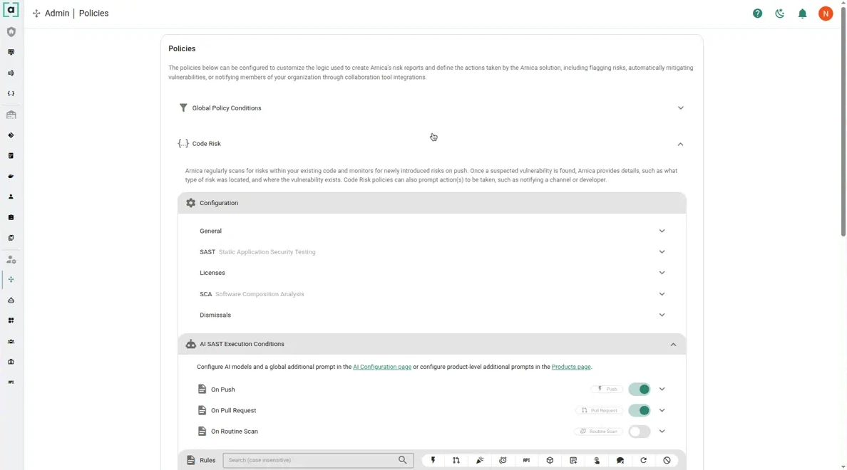 This section allows customers to configure [custom SAST rules](https://docs.arnica.io/arnica-documentation/code-risks/static-application-security-testing-sast/custom-sast-rules) and enable or disable default SAST detections.