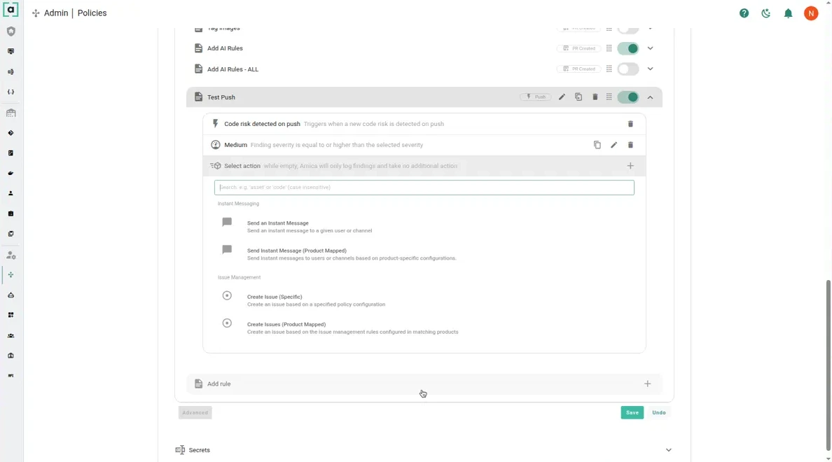 <figure><img src="https://4035514934-files.gitbook.io/~/files/v0/b/gitbook-x-prod.appspot.com/o/spaces%2FMxc1Ek3qoIZi5t2Sx7do%2Fuploads%2Fgit-blob-563325093a2860dadbc4a6303d13db33a71e657c%2Fcode-risk-policy-actions-push-2026-03.webp?alt=media" alt=""><figcaption><p>Action picker for a push-triggered rule</p></figcaption></figure>