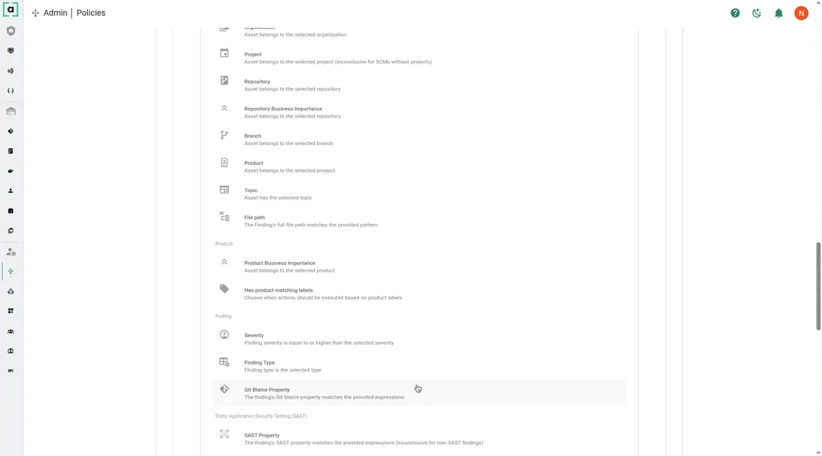 22. **SAST Property**: matches findings by SAST metadata using provided expressions.