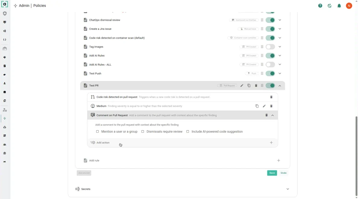 Customers are encouraged to define multiple rules. The rules in the policy are executed in order - if there is a match in the trigger and conditions, Arnica will execute the action and stop processing other rules.