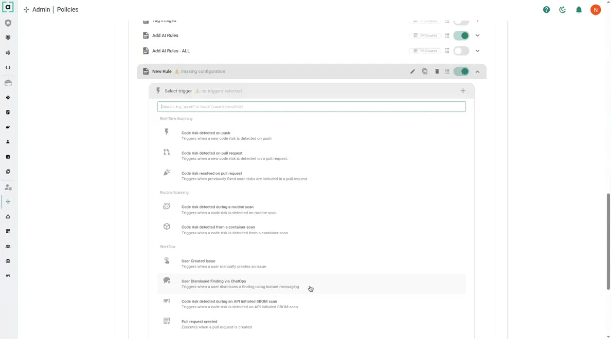 <figure><img src="https://4035514934-files.gitbook.io/~/files/v0/b/gitbook-x-prod.appspot.com/o/spaces%2FMxc1Ek3qoIZi5t2Sx7do%2Fuploads%2Fgit-blob-a0040ea4ec3f5122e23a4a361bf4157f4c587a21%2Fcode-risk-policy-trigger-options-2026-03.webp?alt=media" alt=""><figcaption><p>Trigger picker in the current Code Risk policy UI</p></figcaption></figure>