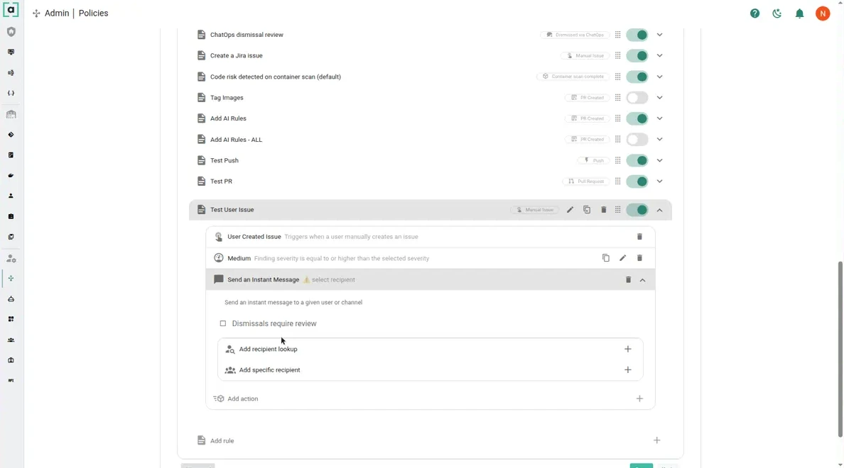 Additional example of a use case we observed is with the legal team, which might be interested in reviewing risky 3rd party package licenses. Since legal teams typically don't interact with the source code management platform, narrow down the conditions to the specific findings types and add actions to send instant messages to the legal team.