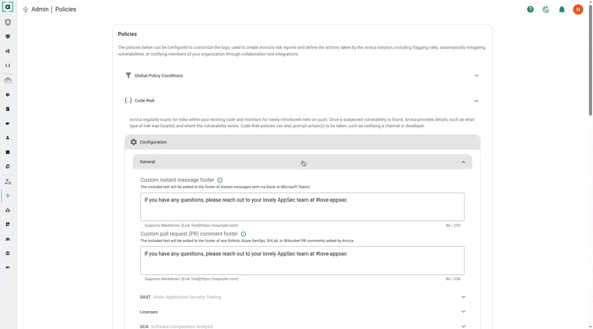 2. **Custom pull request (PR) comment footer**: add a Markdown-enabled footer to PR comments posted by Arnica.