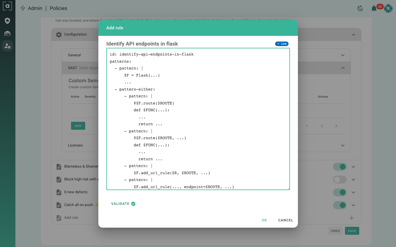 Arnica allows customers to create, manage and edit their own custom SAST rules to identify specific risks across the company. This capability allows customers to override any of Arnica's default rules to improve accuracy, change the description or update the default risk severity. To simplify the process of creating and editing SAST rules, Arnica leverages the default open source SAST rule schema developed by Semgrep and maintained by Opengrep. Rules that are built and tested directly within Opengrep's rules playground can be pasted directly into Arnica's custom SAST rule builder.