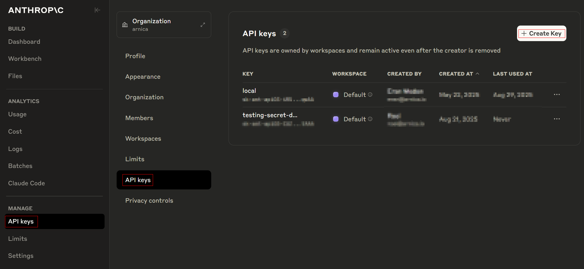 2. Under `Manage`, select [API Keys](https://console.anthropic.com/settings/keys).