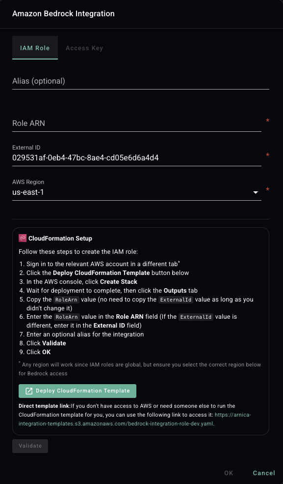 RoleArn, paste it into the Role ARN field in Arnica. If your admin used a different External ID, update the External ID field to match.(Optional) Enter an alias, click Validate, then OK.