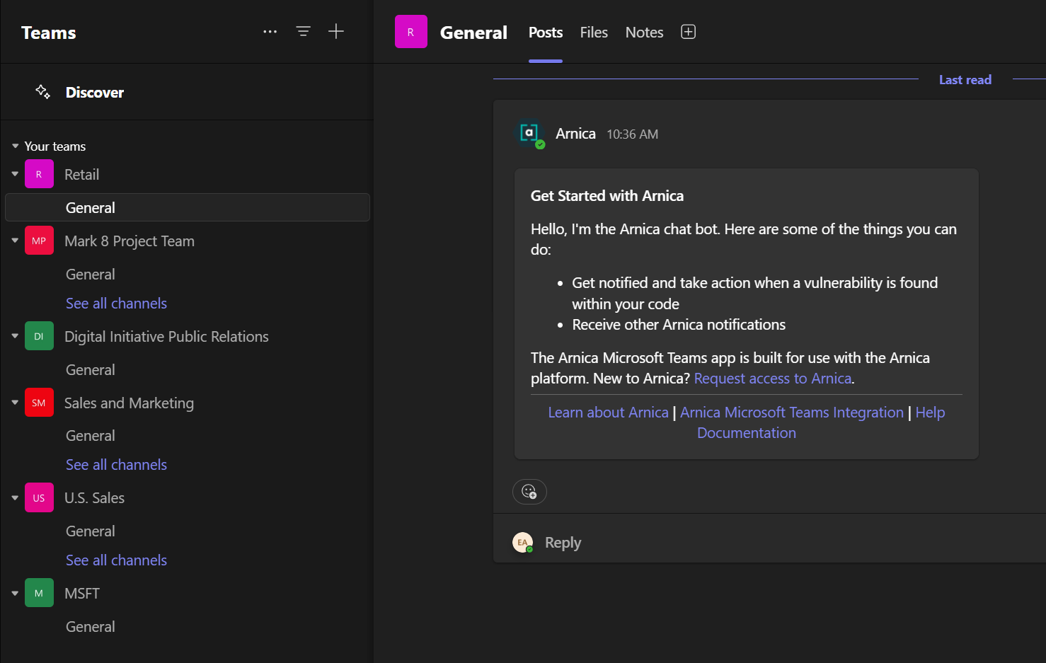 6. Once you complete the post, you will see the Arnica bot joining the team or channel.