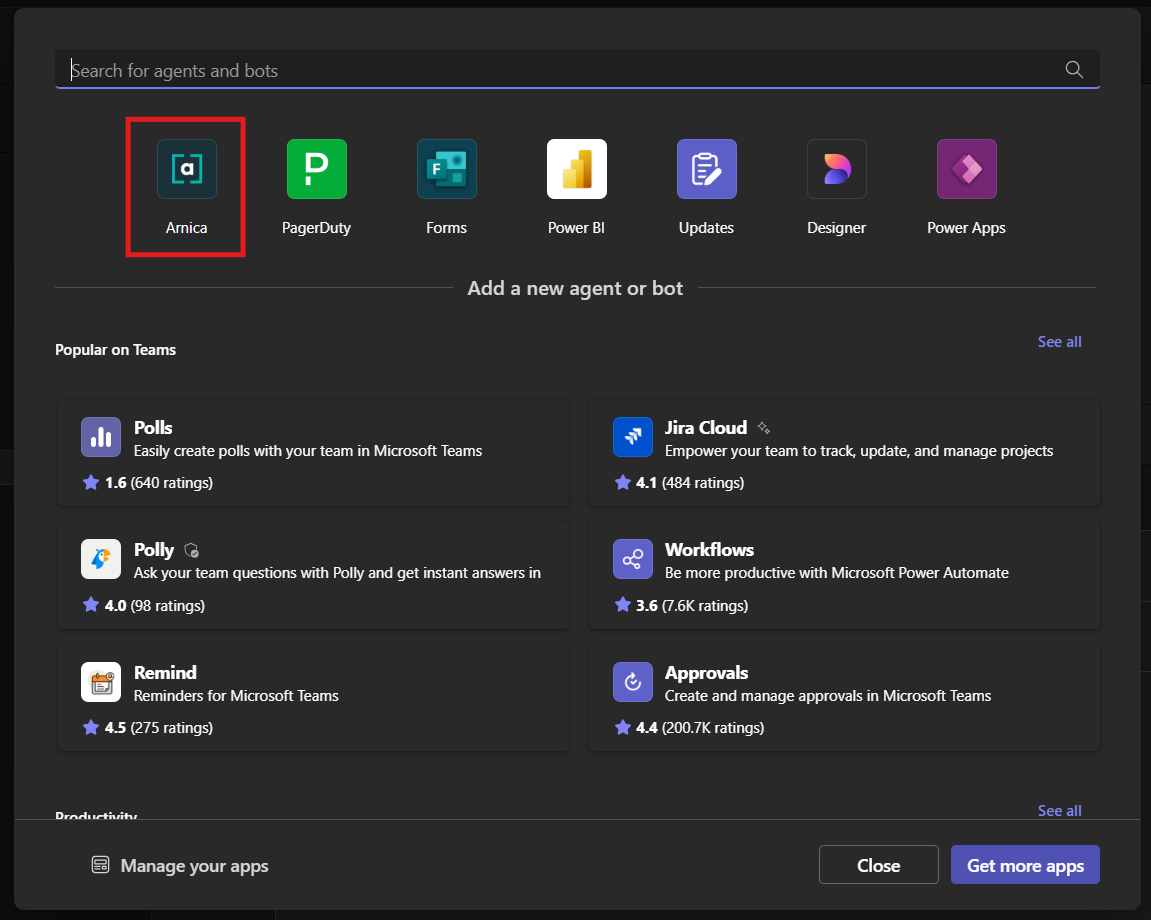 ### Adding the Arnica bot to a Teams chat or channel <a href="#h_646996c2d9" id="h_646996c2d9"></a>