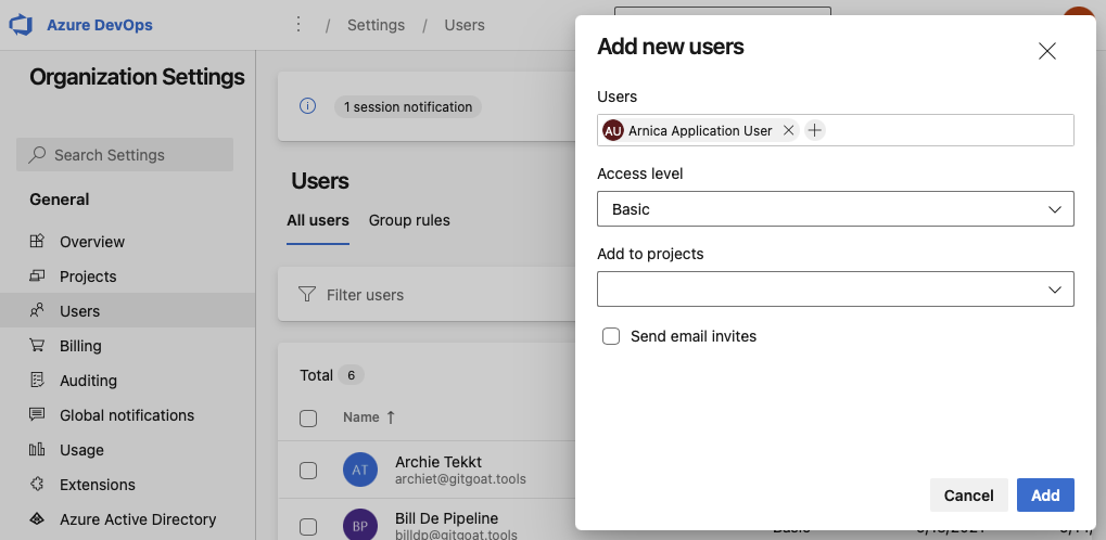 Find your Application User, select a Basic access level, and click on Add.