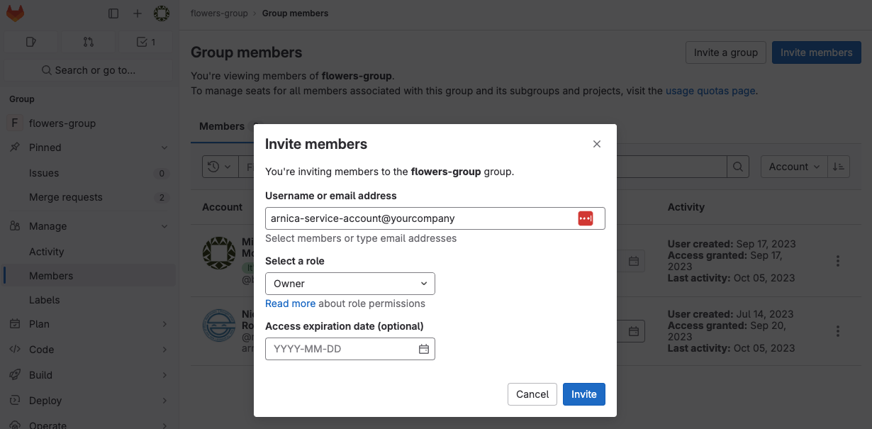 3. Click on `Invite Members` , type the username or email of the dedicated service account, select an `Owner` role, and click on `Invite`
