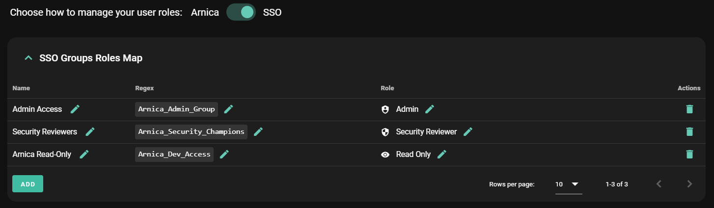 Arnica offers the ability to set roles through the use of SSO groups. When SSO management is set to "SSO", a new configuration window will appear that allows you to define your SSO user groups and map each group to the appropriate Arnica role.\
